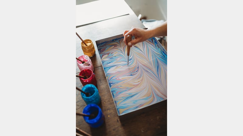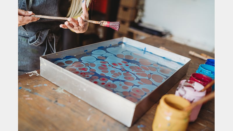 My teaching approach connects deeply with students, ensuring they feel safe and open to learning. I blend traditional marbling roots and materials with space for creative expression using various pigments and surfaces like fabric and ceramics.