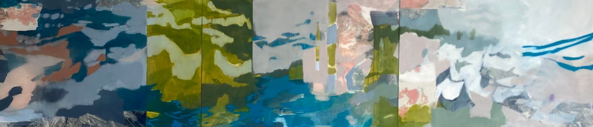 I am interested in gestural marks and surface residue, combined with printed or collaged elements. I tend to work instinctively and discover the image whilst working, although recurring themes shift and reappear through painterly abstraction.